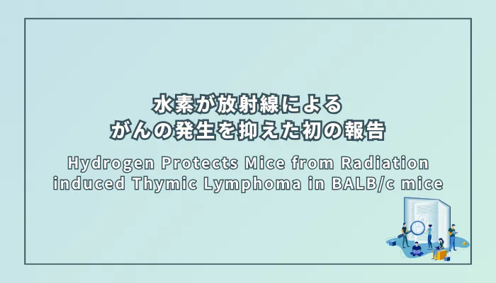 放射線を当てたマウスに、あらかじめ水素を含んだ生理食塩水を投与した。その結果、がん(胸腺リンパ腫)の発生率がおよそ半分に低下し、生存率も向上した。水素が体内の活性酸素(細胞を傷つける物質)を抑え、抗酸化力を維持したことが、そのメカニズムとして示唆されている。